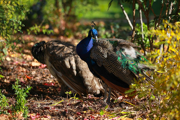 Le contraste entre le mâle paon, éclatant de bleu et de vert, et la femelle plus discrète mais tout aussi présente, crée une tension visuelle très forte. Et dans ce décor végétal, avec les feuilles au sol et les plantes autour, on sent une scène presque théâtrale, mais sans artifice.